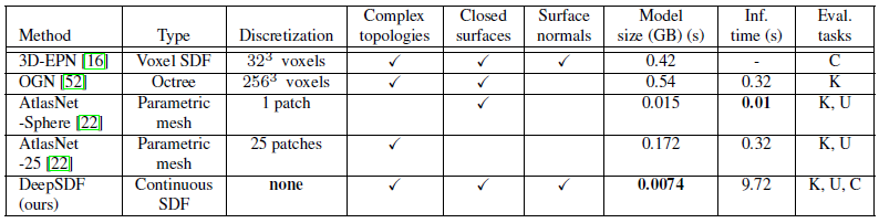 DeepSDF 모델은 표 1에 나온 것과 같이 이전의 최신 결과보다 훨씬 적은 메모리로 더 복잡한 형상을 이산 오류 없이 표현할 수 있도록 지원하여 3D 형상 학습을 위한 흥미로운 경로를 보여줍니다.