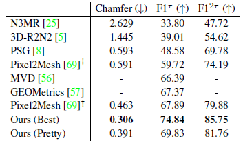 · Pixel2Mesh+: Pixel2Mesh [69]를 재실행했습니다; 백본이 깊어지고 트레이닝 레시피가 향상되어 정점 위치가 아닌 샘플로 챔퍼를 최소화했기 때문에 오리지널 모델보다 성능이 우수합니다.