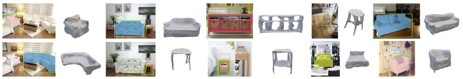 우리의 방법은 이미지당 여러 물체를 감지하고, 의자 다리와 같은 미세한 디테일을 재구성하고, 책장이나 책상 같은 구멍이 있는 물체의 다양하고 복잡한 메시 토폴로지를 예측할 수 있다.