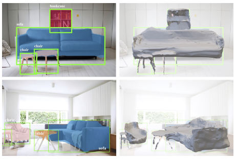 우리는 최첨단 2D 인식 및 3D 형상 예측 방법을 활용하여 실제 RGB 영상을 입력하고, 영상 내 물체를 감지하며, 검출된 각 물체의 완전한 3D 형상을 제공하는 카테고리 라벨, 분할 마스크 및 3D 삼각형 메시를 출력하는 시스템을 구축합니다.