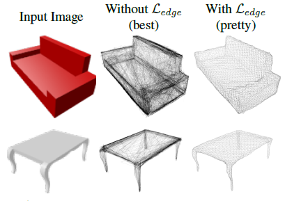 따라서 모든 ShapeNet 모델의 두 가지 버전을 학습합니다: 정량적 퍼포먼스의 상한으로 기능하는 λ_edge = 0의 Best 버전 및 λ_edge = 0.2로 설정함으로써 정량적 퍼포먼스와 메쉬 품질 사이에서 균형을 이루는 Pretty 버전.