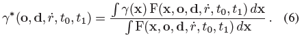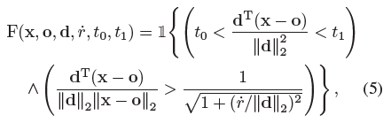 두 t값 [t_0, t_1] 사이의 원뿔형 frustum 내에 있는 위치 x의 집합은 다음과 같다(그림 1에 표시):