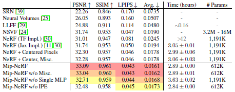 그 결과 mip-NeRF는 NeRF(~7%)보다 약간 빠르며 파라미터의 절반을 가진다.