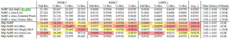"Single MLP" mip-NeRF ablation는 잘 수행되지만 매개 변수가 2배 더 많고 mip-NeRF보다 거의 20% 느리다(이 ablation은 t 값을 정렬해야 하는 필요성과 "coarse" 및 "fine" 척도에 걸쳐 변화하는 텐서 하드웨어 처리량이 낮기 때문일 수 있다).