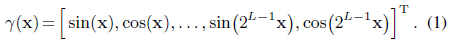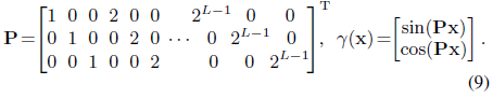 이것은 단순히 1에서 2^(L-1)까지 2의 거듭제곱으로 스케일링된 3D 위치 x의 각 차원의 사인 및 코사인 연결입니다, 여기서 L은 하이퍼 파라미터입니다.