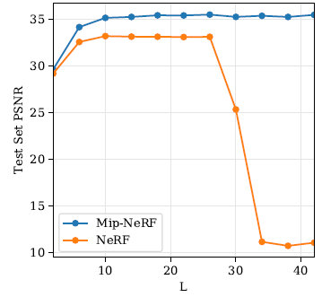 그러나 mip-NeRF에서 L은 임의로 큰 값으로 설정될 수 있고 성능은 영향을 받지 않는다는 것을 알 수 있다.