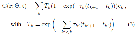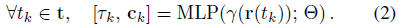 각 ray 위치 γ(r(t_k))의 위치 부호화는 밀도 τ 및 RGB 색상 c를 출력하는 가중치 Θ에 의해 파라미터화된 MLP에 대한 입력으로 제공됩니다: