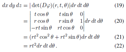 원뿔형 frustum에 대한 uniform 분포의 다양한 모멘트에 대한 공식을 도출하기 위해, 우리는 (x, y, z) = φ(r, t, θ) = (rt cosθ, rt sinθ, t) for θ ∈ [0, 2π), t ≥ 0, |r| ≤ r˙로 매개 변수화된 축-정렬된 원뿔을 고려한다.
