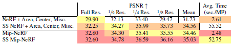 다중 스케일 데이터 세트는 전체 해상도 이미지의 다운샘플링 버전으로 구성되기 때문에, 우리는 전체 해상도 이미지만을 사용하여 NeRF("NeRF + Area, Center, Misc." 변형)를 학습시킨 다음 전체 해상도 이미지만 렌더링하여 "슈퍼샘플링된 NeRF"를 구성할 수 있다.
