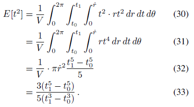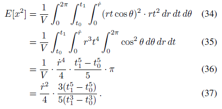 t에 대한 원뿔형 frustum의 분산은 분산의 정의에서 Var(t) = E[t^2] - E[t]^2를 따른다: