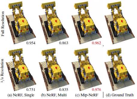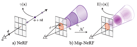 mip-NeRF("mipmap"에서와 같이, multum in parvo NeRF)라고 하는 솔루션은 연속적인 스케일 공간에 대해 사전 필터링된 radiance 필드를 동시에 나타내도록 NeRF를 확장합니다.