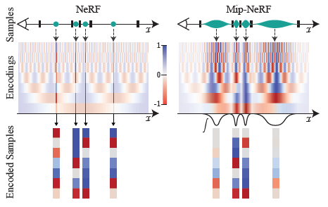 논의된 바와 같이, NeRF의 포인트 샘플링은 샘플링 및 앨리어싱과 관련된 문제에 취약하게 만든다: 픽셀의 색상은 픽셀의 frustum 내에서 들어오는 모든 radiance의 적분이지만 NeRF는 픽셀당 하나의 무한히 좁은 ray를 투사하여 앨리어스를 발생시킨다.