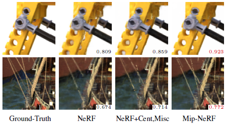"중심" 픽셀은 NeRF의 성능을 크게 향상시키지만 mip-NeRF에 접근하기에는 충분하지 않다.