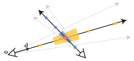r˙를 2/√12로 스케일링된 월드 좌표의 픽셀 폭에 설정했고, 이는 이미지 평면의 섹션이 픽셀 풋프린트의 분산과 일치하는 x와 y의 분산을 갖는 원뿔을 산출한다.