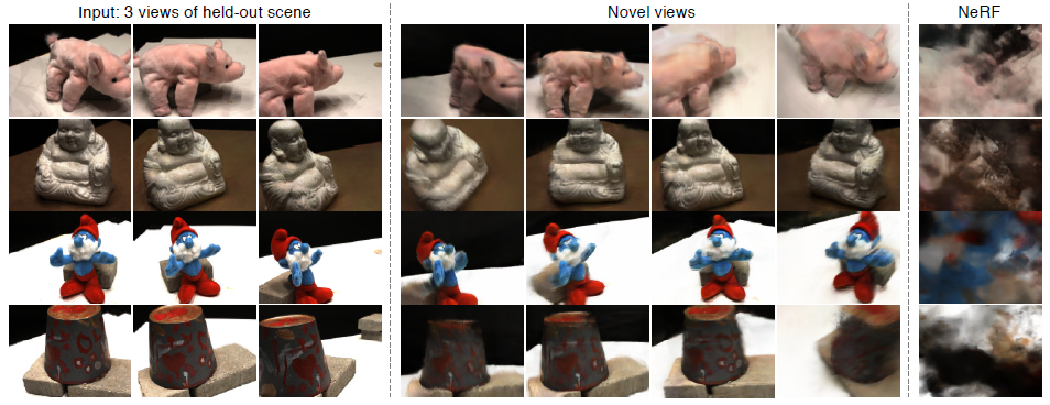 이를 통해 네트워크는 한 장면을 미리 학습하기 위해 여러 장면에서 학습될 수 있으며, 희박한 뷰 세트(한 개만)에서 피드포워드 방식으로 새로운 뷰 합성을 수행할 수 있다.
