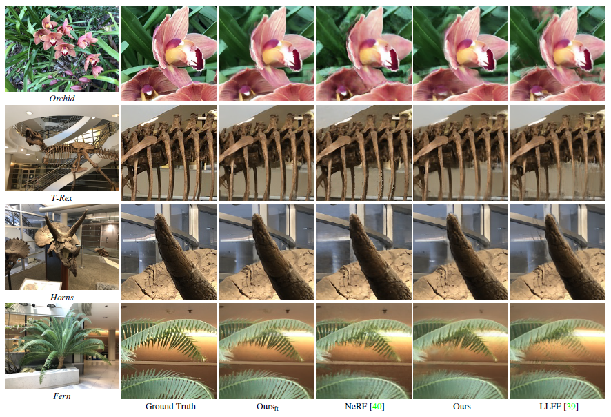 Real Forward-Facing [39] 데이터에서 Ours_ft는 NeRF[40]보다 훨씬 더 나은 SSIM 및 LPIPS를 달성하여 합성된 이미지가 더 사실적으로 보인다는 것을 나타낸다.