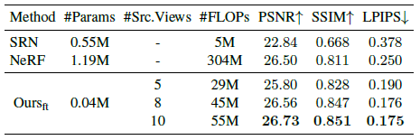 우리는 표 3에서 다양한 수의 소스 뷰에서 단일 픽셀을 렌더링하는 데 필요한 IBRNet 및 #FLOP의 크기를 보고한다.