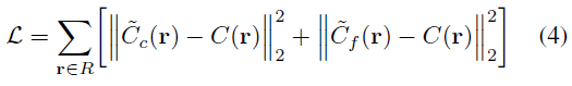 {C_i}_(i=1)^N ∈ [0, 1]^3 및 {f_i}_(i=1)^N ∈ R^d가 각각 점 x에 대해 추출된 색상과 이미지 피쳐를 나타내도록 하자.