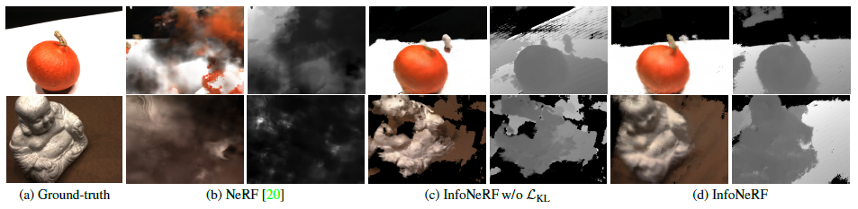 정보 이득 감소 loss가 없는 InfoNeRF는 선명한 이미지를 생성하는 경향이 있지만 출력에 노이즈가 많고 depth 맵에 불일치가 있다.