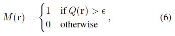 공식적으로, 우리는 마스크 변수 M(·)을 사용하여 장면에 대한 충분한 관찰을 가진 ray를 나타내며, 이는 다음과 같은 불투명도를 기반으로 한다: