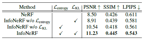 표 2는 8개의 개별 장면으로 PSNR 점수를 분류하는데, InfoNeRF는 모든 장면에서 분명히 상당한 이득을 얻는다.