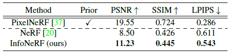 우리 방법의 일반성을 입증하기 위해 제안된 정규화 방법을 PixelNeRF[37]에 통합하고 이 모델 버전을 InfoPixelNeRF라고 한다.