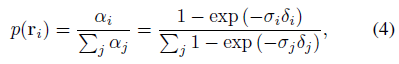 , 여기서 r은 ray, N은 샘플의 수, δ_i는 i^th 점과 인접한 샘플 사이의 거리를 나타낸다.