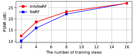 InfoNeRF는 NeRF에 비해 8개 뷰까지 모든 메트릭 측면에서 개선된 결과를 보여주지만 뷰 수가 증가함에 따라 장점이 포화된다.
