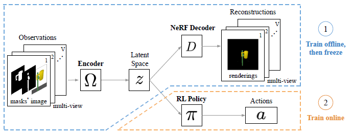우리는 RL 알고리즘이 여러 뷰의 이미지를 latent z로 매핑하는 encoder에 의해 생성된 latent vector로 작동하는 state 표현 z를 제안한다, encoder는 (compositional) latent-conditioned NeRF decoder로 학습된다.