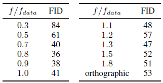우리 모델은 0.7 f_data 내에서 1.0 f_data로의 변경에 대해 매우 유사하게 수행되는데, 여기서 f_data는 학습 이미지를 렌더링하는 데 사용하는 초점 길이이다.