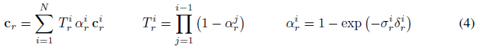 을 사용하여 구하는데, 여기서 T_r^i와 알파_r^i는 ray r을 따른 샘플 포인트 i의 투과도와 알파 값을 나타내고 δ_r^i = |x_r^(i+1) - x_r^i|는 인접 샘플 포인트 사이의 거리를 나타낸다.