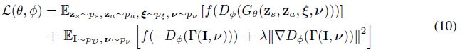 우리는 R1 정규화[34]를 사용하여 비포화 GAN loss를 사용하여 모델을 학습한다: