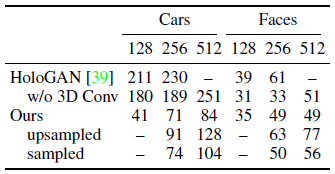 흥미롭게도, 우리는 3D Conv가 없는 HoloGAN이 모델 용량 감소에도 불구하고 [39]에서 원래 제안된 전체 HoloGAN 모델보다 낮은 FID 값을 달성한다는 것을 발견했다.