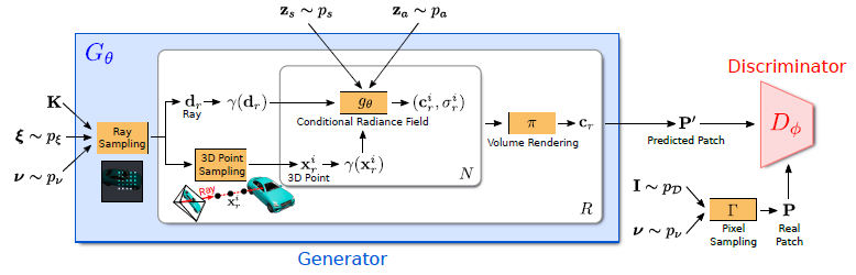 생성기 G_θ는 카메라 매트릭스 K, 카메라 포즈 ξ, 2D 샘플링 패턴 ν 및 형상/외관 코드 z_s ∈ R^m/z_a ∈ R^n을 입력으로 취하고 이미지 패치 P'를 예측한다.