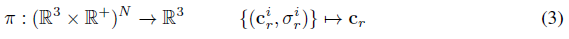 ray r을 따른 모든 점의 색상과 부피 밀도 {(c_r^i, σ_r^i)}가 주어지면, 우리는 식 (3)의 볼륨 렌더링 연산자를 사용하여 ray r에 해당하는 픽셀의 색상 c_r ∈ R^3을 얻는다.