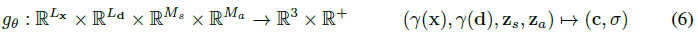 최근의 암시적 모델[10, 35, 48]에 따라, 그들은 결과적인 피쳐를 색상 값 c ∈ R^3 및 부피 밀도 σ ∈ R+에 매핑하기 위한 매개 변수 θ를 가진 다층 퍼셉트론 f_θ(·)를 적용한다:
