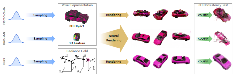 추가 제약 조건을 사용하여 3D 일관성을 장려할 수 있지만 [44], 우리는 학습할 필요가 없는 미분 가능한 볼륨 렌더링 기술을 활용하여 설계에 의해 3D 일관성을 생성 모델에 통합한다.