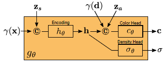 3D 위치 x에서 색상 c를 예측하기 위해, 우리는 h를 d의 위치 인코딩 및 외관 코드 z_a와 연결하고 결과 벡터를 컬러 헤드 c_θ로 전달한다.
