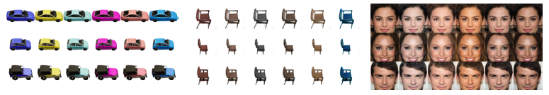 Cars 및 Chairs의 경우 외관 코드가 객체의 색상을 제어하는 반면, Faces의 경우 피부 및 머리카락 색상을 인코딩합니다.