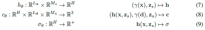 볼륨 컬러 c는 3D 위치보다 보는 방향에 따라 더 부드럽게 변화하므로, 일반적으로 보는 방향은 더 적은 구성 요소, 즉 L_d < L_x를 사용하여 인코딩된다.