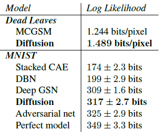 우리는 2차원 스위스 롤, 이진 시퀀스, 손으로 쓴 숫자(MNIST) 및 여러 자연 이미지(CIFAR-10, 나무껍질 및 낙엽) 데이터 세트에 대한 높은 log-likelihood 모델을 학습하여 이러한 diffusion 확률 모델의 유용성을 입증한다.