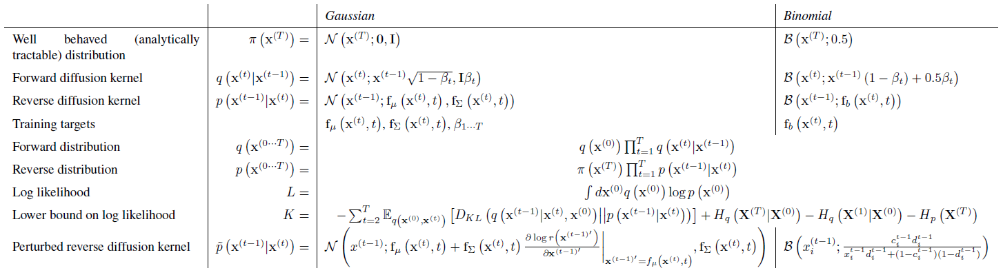 아래에 표시된 실험의 경우, q(x^(t)|x^(t-1))는 동일성-공분산을 가진 가우시안 분포로의 가우시안 diffusion 또는 독립적인 이항 분포로의 이항 diffusion에 해당한다.