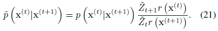 식 21은 정규화된 확률 분포에 해당하지 않을 수 있으므로, 우리는 ~p(x^(t)|x^(t+1))를 상응하는 정규화된 분포