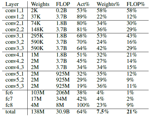 네트워크의 각 레이어에 대해 테이블은 원래 가중치 수(왼쪽에서 오른쪽), 해당 계층의 활성화를 계산하는 부동 소수점 작업 수, 0이 아닌 활성화의 평균 백분율, pruning 후 0이 아닌 가중치의 백분율 및 실제로 필요한 부동 소수점 작업의 백분율을 보여줍니다.