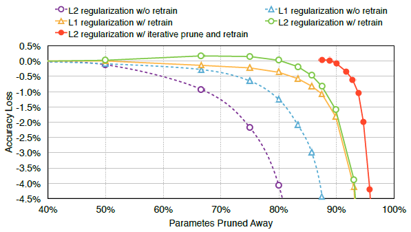 우리는 5개의 트레이드 오프 라인을 제공하기 위해 반복 pruning과 함께 재학습을 사용하거나 사용하지 않고 L1 및 L2 정규화를 실험했습니다.