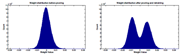 그림 7은 pruning 전과 pruning 후의 가중치 분포 히스토그램을 보여줍니다.