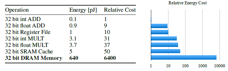 이 데이터에서 우리는 연결당 에너지가 메모리 액세스에 의해 지배되며 온칩 SRAM의 32비트 계수에 대한 5pJ에서 오프칩 DRAM의 32비트 계수에 대한 640pJ까지의 범위를 확인할 수 있습니다 [7].