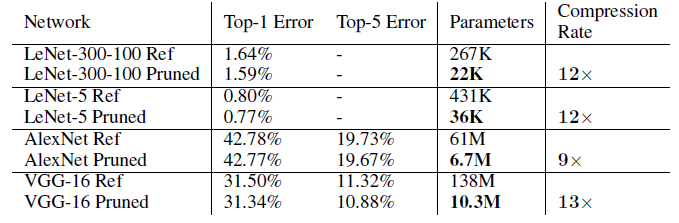 pruning 후 AlexNet 및 VGGNet의 스토리지 요구사항은 액세스하는 데 훨씬 더 많은 에너지가 필요한 오프칩 DRAM 대신 모든 가중치를 칩에 저장할 수 있을 정도로 작습니다(표 1).