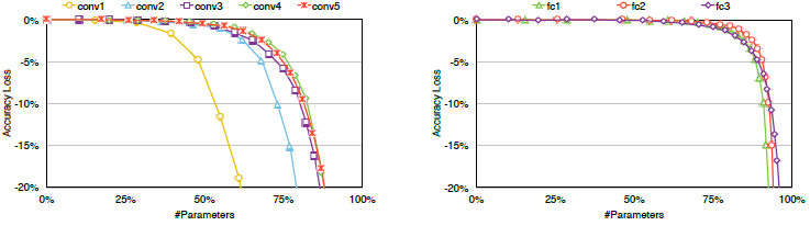 CONV 레이어(왼쪽)는 fully connected 레이어(오른쪽)보다 pruning에 더 민감합니다.