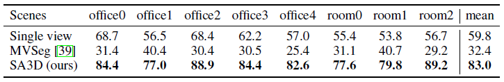 저희는 Zhi et al. [73]에서 제공한 2D 인스턴스 레이블이 있는 처리된 Replica 데이터를 사용하여 SA3D의 세그멘테이션 성능을 평가합니다.
